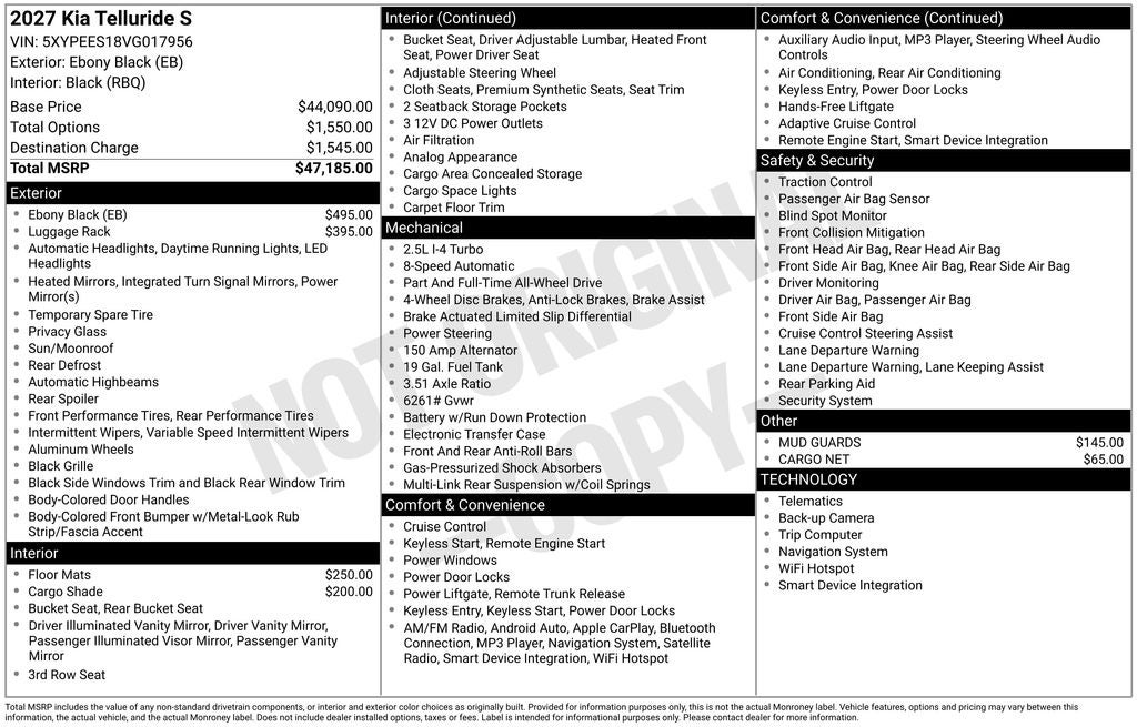 Recent Arrival! Ebony Black 2027 Kia Telluride S AWD 8-Speed Automatic 2.5L I4