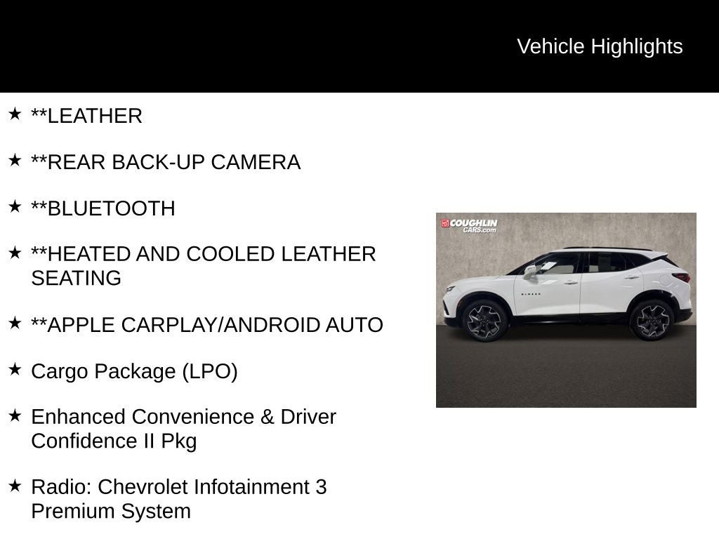 **LEATHER, **REAR BACK-UP CAMERA, **Bluetooth®, **HEATED AND COOLED LEATHER SEATING, **APPLE CARPLAY/ANDROID AUTO, Advanced Adaptive Cruise Control, Apple CarPlay/Android Auto, Cargo Package (LPO), Enhanced Convenience & Driver Confidence II Pkg, Following Distance Indicator, Forward Automatic Braking, Forward Collision Alert, Front Pedestrian Braking, HD Surround Vision, Heated door mirrors, Heated Rear Outboard Seating Positions, IntelliBeam Headlamps, Lane Keep Assist w/Lane Departure Warning, Memory Settings For Driver Seat & Exterior Mirrors, Power Tilt & Telescoping Steering Column, Radio: Chevrolet Infotainment 3 Premium System, Rear Camera Mirror, Retractable Cargo Shade, Safety Alert Seat, Ventilated Driver & Front Passenger Seats, Vertical Cargo Net (LPO), Wheels: 20 Dark Android Machined-Face Aluminum, Wireless Charging, 3.49 Final Drive Ratio, 4-Wheel Disc Brakes, 6 Speakers, 6-Speaker Audio System Feature, 6-Way Power Front Passenger Seat Adjuster, ABS brakes, Air Conditioning, Alloy wheels, AM/FM radio: SiriusXM, Auto-dimming door mirrors, Auto-dimming Rear-View mirror, Automatic temperature control, Brake assist, Bumpers: body-color, Child-Seat-Sensing Airbag, Compass, Delay-off headlights, Driver door bin, Driver vanity mirror, Dual front impact airbags, Dual front side impact airbags, Electronic Stability Control, Emergency communication system: OnStar and Chevrolet connected services capable, Four wheel independent suspension, Front anti-roll bar, Front Bucket Seats, Front Center Armrest, Front dual zone A/C, Front reading lights, Fully automatic headlights, Garage door transmitter, Heated Driver & Front Passenger Seats, Heated front seats, Heated steering wheel, High-Intensity Discharge Headlights, Illuminated entry, Interior Protection Package (LPO), Knee airbag, Leather Shift Knob, Low tire pressure warning, Navigation System, Occupant sensing airbag, Outside temperature display, Overhead airbag, Overhead console, Panic alarm, Passenger door bin, Passenger vanity mirror, Perforated Leather-Appointed Seat Trim, Power door mirrors, Power driver seat, Power Liftgate, Power passenger seat, Power steering, Power windows, Preferred Equipment Group 1RS, Premium All-Weather Cargo Mat (LPO), Premium All-Weather Floor Mats, Radio data system, Radio: Chevrolet Infotainment 3 Plus System, Rear anti-roll bar, Rear reading lights, Rear seat center armrest, Rear window defroster, Rear window wiper, Remote keyless entry, Ride & Handling Suspension, Roof rack: rails only, Security system, Set of 4 Wheel Locks (LPO), Speed control, Speed-sensing steering, Split folding rear seat, Spoiler, Steering wheel mounted audio controls, Tachometer, Telescoping steering wheel, Tilt steering wheel, Traction control, Trip computer, Turn signal indicator mirrors, Variably intermittent wipers, Voltmeter, Advanced Adaptive Cruise Control, Apple CarPlay/Android Auto, Cargo Package (LPO), Enhanced Convenience & Driver Confidence II Pkg, Following Distance Indicator, Forward Automatic Braking, Forward Collision Alert, Front Pedestrian Braking, HD Surround Vision, Heated door mirrors, Heated Rear Outboard Seating Positions, IntelliBeam Headlamps, Lane Keep Assist w/Lane Departure Warning, Memory Settings For Driver Seat & Exterior Mirrors, Power Tilt & Telescoping Steering Column, Radio: Chevrolet Infotainment 3 Premium System, Rear Camera Mirror, Retractable Cargo Shade, Safety Alert Seat, Ventilated Driver & Front Passenger Seats, Vertical Cargo Net (LPO), Wheels: 20 Dark Android Machined-Face Aluminum, Wireless Charging.