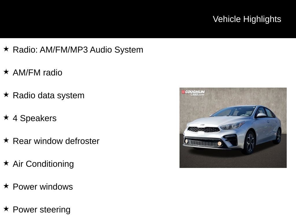 Silky Silver 2020 Kia Forte LXS FWD CVT 2.0L 4-Cylinder MPI Forte LXS, 4D Sedan, 2.0L 4-Cylinder MPI, CVT, FWD, Silky Silver, Black Cloth, 4 Speakers, 4-Wheel Disc Brakes, ABS brakes, Air Conditioning, Alloy wheels, AM/FM radio, Apple CarPlay & Android Auto, Brake assist, Bumpers: body-color, Delay-off headlights, Driver door bin, Driver vanity mirror, Dual front impact airbags, Dual front side impact airbags, Electronic Stability Control, Exterior Parking Camera Rear, Front anti-roll bar, Front Bucket Seats, Front Center Armrest, Front reading lights, Front wheel independent suspension, Fully automatic headlights, Illuminated entry, Low tire pressure warning, Occupant sensing airbag, Overhead airbag, Overhead console, Panic alarm, Passenger door bin, Passenger vanity mirror, Power door mirrors, Power steering, Power windows, Radio data system, Radio: AM/FM/MP3 Audio System, Rear window defroster, Remote keyless entry, Security system, Speed control, Split folding rear seat, Steering wheel mounted audio controls, Tachometer, Telescoping steering wheel, Tilt steering wheel, Traction control, Trip computer, Variably intermittent wipers, Wheels: 16 Machine Finish Alloy, Woven Cloth Seat Trim.