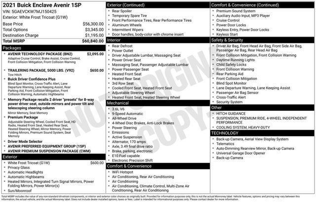 10 Speakers, 120-Volt Power Outlet, 3.49 Axle Ratio, 3rd Row 60/40 Power Fold Split-Bench, 3rd row seats: split-bench, 4-Wheel Disc Brakes, 5000lbs Trailering Package, 7-Passenger Seating, ABS brakes, Adaptive Cruise Control, Air Conditioning, Alloy wheels, AM/FM radio: SiriusXM with 360L, Apple CarPlay/Android Auto, Audio memory, Auto High-beam Headlights, Auto tilt-away steering wheel, Auto-dimming door mirrors, Auto-dimming Rear-View mirror, Automatic Heated Steering Wheel, Automatic temperature control, Avenir Package, Avenir Premium Suspension Package, Avenir Technology Package, Bose Performance-Enhanced 10-Speaker System, Brake assist, Bumpers: body-color, Chassis Continuously Variable Real Time Damping, Compass, Delay-off headlights, Driver 4-Way Power Lumbar Seat Adjuster, Driver door bin, Driver vanity mirror, Dual front impact airbags, Dual front side impact airbags, Electronic Stability Control, Emergency communication system: OnStar and Buick connected services capable, Enhanced Automatic Emergency Braking, Four wheel independent suspension, Front anti-roll bar, Front Bucket Seats, Front Center Armrest, Front dual zone A/C, Front Passenger 4-Way Power Lumbar Seat Adjuster, Front Power Sliding Moonroof, Front reading lights, Fully automatic headlights, Garage door transmitter, HD Radio, HD Surround Vision, Heated 2nd Row Outboard Seats, Heated door mirrors, Heated Driver & Front Passenger Seats, Heated front seats, Heated rear seats, Heated steering wheel, Heavy-Duty Cooling System, Hitch Guidance, Hitch Guidance w/Hitch View, Illuminated entry, Inside Rearview Mirror w/Full Camera Display, Leather steering wheel, Low tire pressure warning, Memory Package, Memory seat, Navigation System, Occupant sensing airbag, Outside Heated Power-Adjustable Mirrors, Outside temperature display, Overhead airbag, Overhead console, Panic alarm, Passenger door bin, Passenger vanity mirror, Perforated Leather-Appointed Seat Trim, Power door mirrors, Power driver seat, Power Liftgate, Power moonroof, Power passenger seat, Power steering, Power Tilt & Telescopic Steering Column, Power windows, Preferred Equipment Group 1SP, Premium audio system: Buick Infotainment System, Premium Ride Suspension, Radio data system, Radio: Buick Infotainment Sys AM/FM Stereo w/Nav, Rear air conditioning, Rear anti-roll bar, Rear reading lights, Rear window defroster, Rear window wiper, Remote keyless entry, Roof rack: rails only, Security system, SiriusXM w/360L, Speed control, Speed-sensing steering, Spoiler, Steering wheel memory, Steering wheel mounted audio controls, Tachometer, Telescoping steering wheel, Tilt steering wheel, Traction control, Trip computer, Turn signal indicator mirrors, Variably intermittent wipers, Ventilated Driver & Front Passenger Seats, Ventilated front seats, Voltmeter, Wheels & Front Door Badging, Wheels: 20 Aluminum w/Premium Pearl Nickel Finish, Wireless Charging. 2021 Buick Enclave Clean CARFAX.
