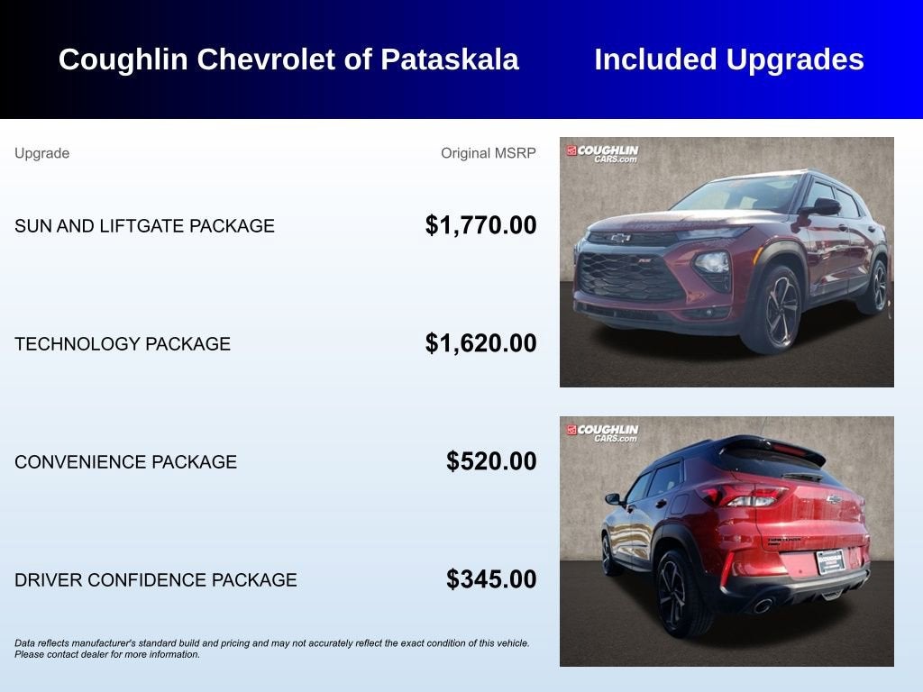 Crimson Metallic 2022 Chevrolet TrailBlazer RS CARFAX One-Owner. 26/30 City/Highway MPGAwards:* 2022 IIHS Top Safety Pick+ Please call or e-mail first for the best and quickest information. Visit www.coughlinpataskala.com to see more of this store’s new and used vehicle inventory for sale. Price excludes tax, title, license and document fee. While we make every effort to prevent pricing errors, key stroke and human errors do occur. Please contact dealer for details.