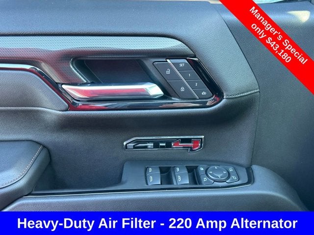 Sierra 1500 AT4, 4D Crew Cab, EcoTec3 6.2L V8, 10-Speed Automatic, 4WD, Onyx Black, Jet Black With Kalahari Accents Leather, 120-Volt Bed Mounted Power Outlet, 120-Volt Instrument Panel Power Outlet, 2 Charge/Data USB Ports Inside Center Console, 2 Type-C Charge-Only Rear USB Ports, 2 USB Ports, 220 Amp Alternator, Adaptive Cruise Control, AT4 Preferred Package, AT4 Premium Package, Auto-Locking Rear Differential, Bed View Camera, Black Chrome Header & Grille Insert Bars, Color-Keyed Carpeting Floor Covering, Compass, Deep-Tinted Glass, Electric Rear-Window Defogger, Electrical Steering Column Lock, Floor-Mounted Center Console, Front Prem Floor Liners w/Removable Carpet Insert, Front Rainsensing Wipers, GMC Connected Access Capable, HD Rear Vision Camera, HD Surround Vision, Heated 2nd Row Outboard Seats, Heated Driver & Front Outboard Passenger Seating, Heated Steering Wheel, Heavy-Duty Air Filter, Hill Descent Control, Hitch Guidance, Hitch Guidance w/Hitch View, In-Vehicle Trailering App, Integrated Trailer Brake Controller, Keyless Open & Start, LED Cargo Area Lighting, Multicolor 15 Diagonal Head-Up Display, Off-Road High Clearance Step (LPO), OnStar & GMC Connected Services Capable, Perimeter Lighting, Power Door Locks, Power Front Passenger Windows w/Express Up/Down, Power Front Windows w/Driver Express Up/Down, Power Rake & Telescoping Steering Column, Power Rear Windows w/Express Down, Power Sliding Rear Window w/Rear Defogger, Preferred Equipment Group 4SB, Premium Bose 7-Speaker Sound System, Push Button Start, Rear Camera Mirror, Rear Cross Traffic Braking, Rear Pedestrian Detection, Rear Prem Floor Liners w/Removable Carpet Insert, Rear Wheelhouse Liners, Red Recovery Hooks, Remote Vehicle Starter System, Sierra Safety Plus Package, SiriusXM w/360L, Spray-On Pickup Bed Liner w/AT4 Logo, Steering Wheel Audio Controls, Technology Package, Theft Deterrent System (Unauthorized Entry), Trailer Camera Provisions, Trailer Side Blind Zone Alert, Trailering Package, Ultrasonic Front & Rear Park Assist, Universal Home Remote, Ventilated Driver & Front Passenger Seats, Wi-Fi Hotspot Capable, Wireless Charging, Wireless Phone Projection.