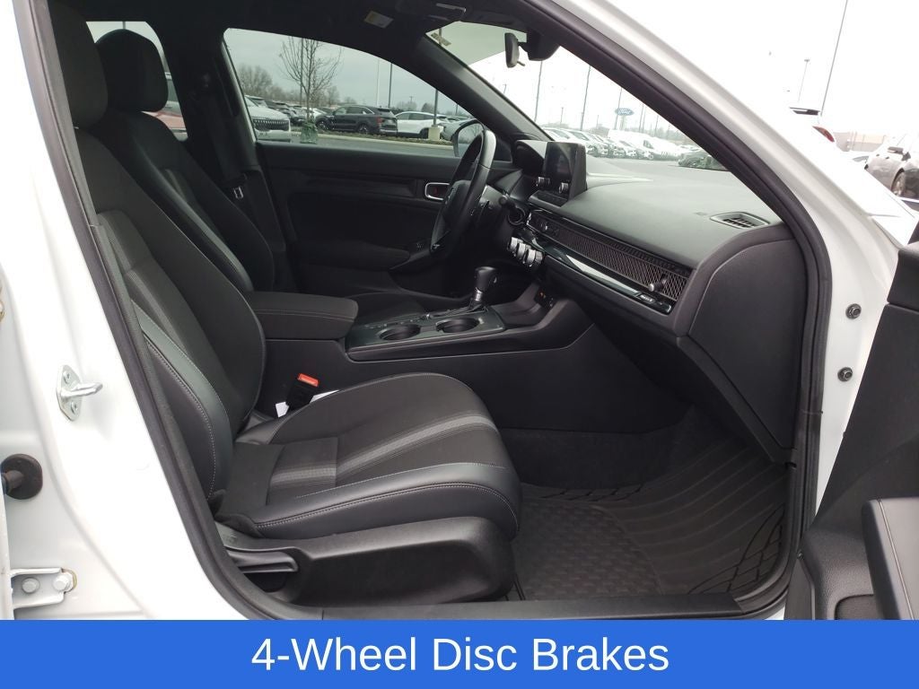 Platinum White Pearl 2022 Honda Civic Sport FWD CVT 2.0L I4 DOHC 16V i-VTEC Black w/Cloth Seat Trim, 4-Wheel Disc Brakes, 8 Speakers, ABS brakes, Adaptive Cruise Control: Adaptive Cruise Control (ACC) with Low-Speed Follow, Air Conditioning, Alloy wheels, AM/FM radio, Apple CarPlay/Android Auto, Auto High-beam Headlights, Automatic temperature control, Brake assist, Bumpers: body-color, Cloth Seat Trim, Delay-off headlights, Driver door bin, Driver vanity mirror, Dual front impact airbags, Dual front side impact airbags, Electronic Stability Control, Emergency communication system: HondaLink, Exterior Parking Camera Rear, Forward collision: Collision Mitigation Braking System (CMBS) + FCW mitigation, Four wheel independent suspension, Front anti-roll bar, Front Bucket Seats, Front Center Armrest, Front reading lights, Fully automatic headlights, Illuminated entry, Knee airbag, Leather Shift Knob, Leather steering wheel, Low tire pressure warning, Occupant sensing airbag, Outside temperature display, Overhead airbag, Panic alarm, Passenger door bin, Passenger vanity mirror, Power door mirrors, Power steering, Power windows, Radio data system, Radio: 180-Watt AM/FM Audio System, Rear anti-roll bar, Rear side impact airbag, Rear window defroster, Remote keyless entry, Security system, Speed control, Speed-sensing steering, Steering wheel mounted audio controls, Tachometer, Telescoping steering wheel, Tilt steering wheel, Traction control, Trip computer, Wheels: 18 Gloss Black Alloy.