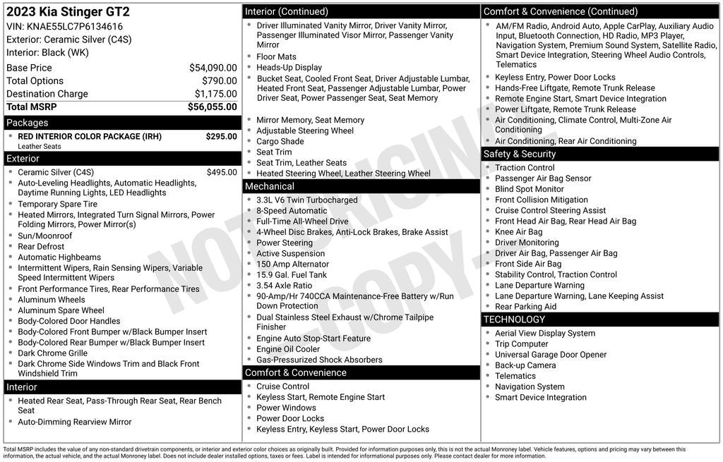 Equipped with Red Interior Color Package (Red Leather Seat Trim), Kia Certified Pre-Owned Certified, 15 Speakers, 4-Wheel Disc Brakes, ABS brakes, Adaptive suspension, Air Conditioning, Alloy wheels, AM/FM radio: SiriusXM, Anti-whiplash front head restraints, Apple CarPlay & Android Auto, Auto High-beam Headlights, Auto tilt-away steering wheel, Auto-dimming door mirrors, Auto-dimming Rear-View mirror, Automatic temperature control, Brake assist, Bumpers: body-color, Compass, Delay-off headlights, Driver door bin, Driver vanity mirror, Dual front impact airbags, Dual front side impact airbags, Electronic Stability Control, Emergency communication system, Four wheel independent suspension, Front anti-roll bar, Front Bucket Seats, Front Center Armrest, Front dual zone A/C, Front reading lights, Fully automatic headlights, Garage door transmitter: HomeLink, harman/kardon® Speakers, Heads-Up Display, Heated & Ventilated Front Bucket Seats, Heated door mirrors, Heated front seats, Heated rear seats, Heated steering wheel, Illuminated entry, Knee airbag, Low tire pressure warning, Memory seat, Nappa Leather Seat Trim, Navigation System, Occupant sensing airbag, Outside temperature display, Overhead airbag, Overhead console, Panic alarm, Passenger door bin, Passenger vanity mirror, Power door mirrors, Power driver seat, Power Liftgate, Power moonroof, Power passenger seat, Power steering, Power windows, Radio: harmon/kardon AM/FM/MP3/HD Audio System, Rain sensing wipers, Rear air conditioning, Rear anti-roll bar, Rear reading lights, Rear seat center armrest, Rear window defroster, Remote keyless entry, Security system, Smart Key w/ Push Button and Remote Start, Speed control, Speed-sensing steering, Speed-Sensitive Wipers, Split folding rear seat, Sport steering wheel, Steering wheel memory, Steering wheel mounted audio controls, Tachometer, Telescoping steering wheel, Tilt steering wheel, Traction control, Trip computer, Turn signal indicator mirrors, Variably intermittent wipers, Ventilated front seats, and Wheels: 8.0J x 19 Front/8.5J x 19 Rear Spire Alloy.