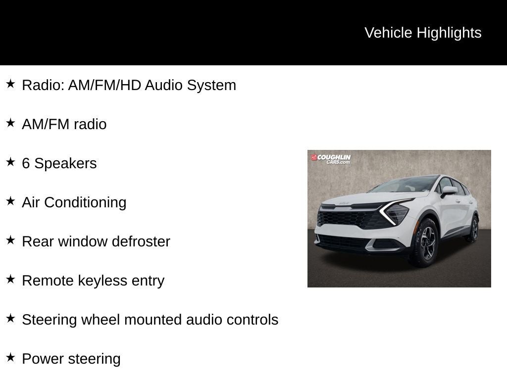 Snow White Pearl 2024 Kia Sportage LX FWD 8-Speed Automatic I4 Sportage LX, 4D Sport Utility, I4, 8-Speed Automatic, FWD, Snow White Pearl, Black Cloth, 17 Alloy Wheels, 4-Wheel Disc Brakes, 6 Speakers, ABS brakes, Air Conditioning, Alloy wheels, AM/FM radio, Auto High-beam Headlights, Axle Ratio: 3.648, Brake assist, Bumpers: body-color, Cargo Cover, Cargo Net Hybrid w/o Audio, Cargo Tray, Carpeted Floor Mats, Cloth Seat Trim, Delay-off headlights, Driver door bin, Driver vanity mirror, Dual front impact airbags, Dual front side impact airbags, Electronic Stability Control, Four wheel independent suspension, Front anti-roll bar, Front Bucket Seats, Front Center Armrest, Fully automatic headlights, Illuminated entry, Low tire pressure warning, Occupant sensing airbag, Outside temperature display, Overhead airbag, Overhead console, Panic alarm, Passenger door bin, Passenger vanity mirror, Power door mirrors, Power steering, Power windows, Radio: AM/FM/HD Audio System, Rear anti-roll bar, Rear seat center armrest, Rear side impact airbag, Rear window defroster, Rear window wiper, Remote keyless entry, Security system, Speed control, Speed-sensing steering, Split folding rear seat, Spoiler, Steering wheel mounted audio controls, Tachometer, Telescoping steering wheel, Tilt steering wheel, Traction control, Trip computer, Variably intermittent wipers.