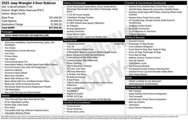 4-Wheel Disc Brakes, 4.10 Rear Axle Ratio, 4G LTE Wi-Fi Hot Spot, 8 Speakers, 97 MPH Vehicle Max Speed Calibration, ABS brakes, Air Conditioning, Alloy wheels, AM/FM radio: SiriusXM, Apple CarPlay, Apple CarPlay/Android Auto, Automatic temperature control, Aux Battery, Auxiliary Switches, Brake assist, Class II Receiver Hitch, Cloth Low-Back Bucket Seats, Compass, Connectivity - US/Canada, Convenience Group, Delay-off headlights, Driver door bin, Driver vanity mirror, Dual front impact airbags, Dual front side impact airbags, Electronic Stability Control, Emergency communication system: Jeep Connect, Front anti-roll bar, Front Bucket Seats, Front Center Armrest w/Storage, Front dual zone A/C, Front fog lights, Front License Plate Bracket (DISC), Front reading lights, Fully automatic headlights, Google Android Auto, Heated door mirrors, Heated Front Seats, Heated Steering Wheel, Illuminated entry, Integrated roll-over protection, Low tire pressure warning, Non-Lock Fuel Cap w/o Discriminator, Occupant sensing airbag, Outside temperature display, Overhead airbag, Panic alarm, ParkView Rear Back-Up Camera, Passenger door bin, Passenger vanity mirror, Performance Suspension, Power door mirrors, Power steering, Power windows, Quick Order Package 24R Rubicon, Radio data system, Radio: Uconnect 5 w/12.3 Display, Rear anti-roll bar, Rear reading lights, Remote keyless entry, Security system, Speed control, Split folding rear seat, Steering wheel mounted audio controls, Stop-Start Dual Battery System, Tachometer, Telescoping steering wheel, Tilt steering wheel, Traction control, Trip computer, Universal Garage Door Opener, Variably intermittent wipers, Voltmeter, Wheels: 17 x 7.5 Machined/Painted Black. 2025 Jeep Wrangler CARFAX One-Owner. Clean CARFAX.