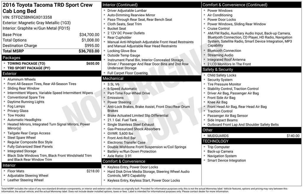 At Coughlin Automotive, we're committed to providing you with the best possible ownership experience. Our team of knowledgeable and friendly professionals are here to guide you through the buying process and ensure you drive away in the vehicle that's perfect for you. Come in today and let us show you why the 2016 Toyota Tacoma TRD Sport V6 should be your next adventure partner.