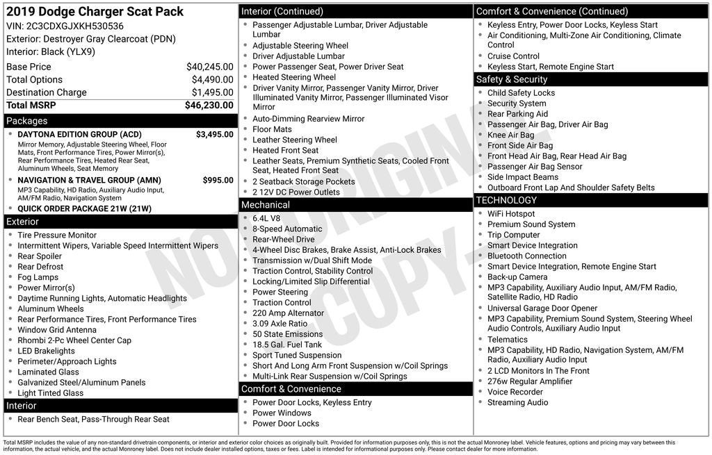 ***CALL 740-773-2153 FOR MOST ACCURATE INFORMATION***This 2019 Dodge Charger R/T Scat Pack is a true performance powerhouse that commands attention on the road. With its SRT HEMI 6.4L V8 engine, 8-speed automatic transmission, and rear-wheel drive, this Charger delivers an exhilarating driving experience that will leave you craving more.- DAYTONA EDITION GROUP- NAVIGATION & TRAVEL GROUPSlip behind the wheel and feel the rush of 485 horsepower at your fingertips. The Scat Pack's Brembo brakes and sport-tuned suspension provide precise handling and control, while the Pirelli performance tires grip the road with confidence. The bold Daytona styling cues, including the unique hood, roof, and trunk decals, set this Charger apart from the crowd.Inside, you'll find a wealth of premium features that elevate the driving experience. The Uconnect 4C navigation system with an 8.4-inch display keeps you connected and informed, while the heated and ventilated front seats, heated steering wheel, and premium-stitched dash provide exceptional comfort. The Daytona-themed interior accents, including the Carbonite trim and Nappa/Alcantara sport seats, add a touch of sophistication.This Charger R/T Scat Pack is more than just a high-performance sedan - it's a true automotive icon that blends power, style, and technology. Whether you're carving through winding roads or cruising the highway, this Dodge will deliver an unforgettable driving experience.Don't miss your chance to own this exceptional 2019 Dodge Charger R/T Scat Pack. Schedule a test drive today and experience the thrill of pure American muscle.Why Buy From Coughlin?At Coughlin Automotive, we keep over 1,000 pre-owned vehicles in stock across 18 dealerships. Enjoy small-town service with big-store selection. Every vehicle is inspected, competitively priced, and backed by our commitment to honesty, value, and customer satisfaction.We carry all makes and models and have vehicles in all different colors. Our pre-owned vehicles could have some of the following features listed: Alloy wheels, aluminum wheels, backup camera, Bluetooth®, cargo package, chrome wheels, convenience package, leather seats, navigation system, power package, remote start, SE package, safety package, sunroof/moonroof, tow package, adaptive cruise control, comfort package, trailer package, appearance package, acoustical package, DVD entertainment system, preferred package, technology package, driver confidence package, audio package, heat package, memory package, off-road package, premium package, premium sound package, remote vehicle starter prep package.
