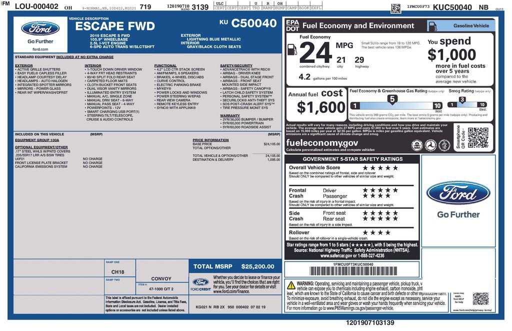 ***CALL 740-773-2153 FOR MOST ACCURATE INFORMATION***Discover the versatility and convenience of the 2019 Ford Escape S. This well-equipped SUV offers the perfect blend of practicality and style, making it an exceptional choice for your next adventure.- Remote Keyless Entry- Steering Wheel Mounted Audio Controls- Rear Window Defroster- Power Windows- Air ConditioningBoasting an impressive 29 highway mpg, the 2.5L i-VCT engine and 6-Speed Automatic transmission provide a seamless and efficient driving experience. With its spacious interior and ample cargo capacity, the Escape S is ready to accommodate all your needs, whether it's a weekend getaway or a daily commute.Safety is of the utmost importance, and this Escape S is equipped with a comprehensive suite of advanced safety features, including Dual Front Impact Airbags, Dual Front Side Impact Airbags, Electronic Stability Control, and Brake Assist. You can navigate the roads with confidence, knowing your safety is a top priority.The exterior of the 2019 Ford Escape S boasts a sleek and modern design, with a Blue finish that is sure to turn heads. The Fully Automatic Headlights and Delay-Off Headlights ensure you're always well-lit, while the Power Door Mirrors and Compass provide added convenience and functionality.Step inside and experience the comfort and connectivity of the Escape S. The Cloth Front Bucket Seats and Front Center Armrest provide a comfortable and supportive ride, while the SYNC Communications & Entertainment System keeps you connected and entertained on the go.Don't miss the opportunity to make this exceptional 2019 Ford Escape S your own. Schedule a test drive today and discover the perfect blend of style, performance, and safety that this SUV has to offer.***CALL 740-773-2153 FOR MOST ACCURATE INFORMATION***Why Buy From Coughlin?At Coughlin Automotive, we keep over 1,000 pre-owned vehicles in stock across 18 dealerships. Enjoy small-town service with big-store selection. Every vehicle is inspected, competitively priced, and backed by our commitment to honesty, value, and customer satisfaction.We carry all makes and models and have vehicles in all different colors. Our pre-owned vehicles could have some of the following features listed: Alloy wheels, aluminum wheels, backup camera, Bluetooth®, cargo package, chrome wheels, convenience package, leather seats, navigation system, power package, remote start, SE package, safety package, sunroof/moonroof, tow package, adaptive cruise control, comfort package, trailer package, appearance package, acoustical package, DVD entertainment system, preferred package, technology package, driver confidence package, audio package, heat package, memory package, off-road package, premium package, premium sound package, remote vehicle starter prep package.