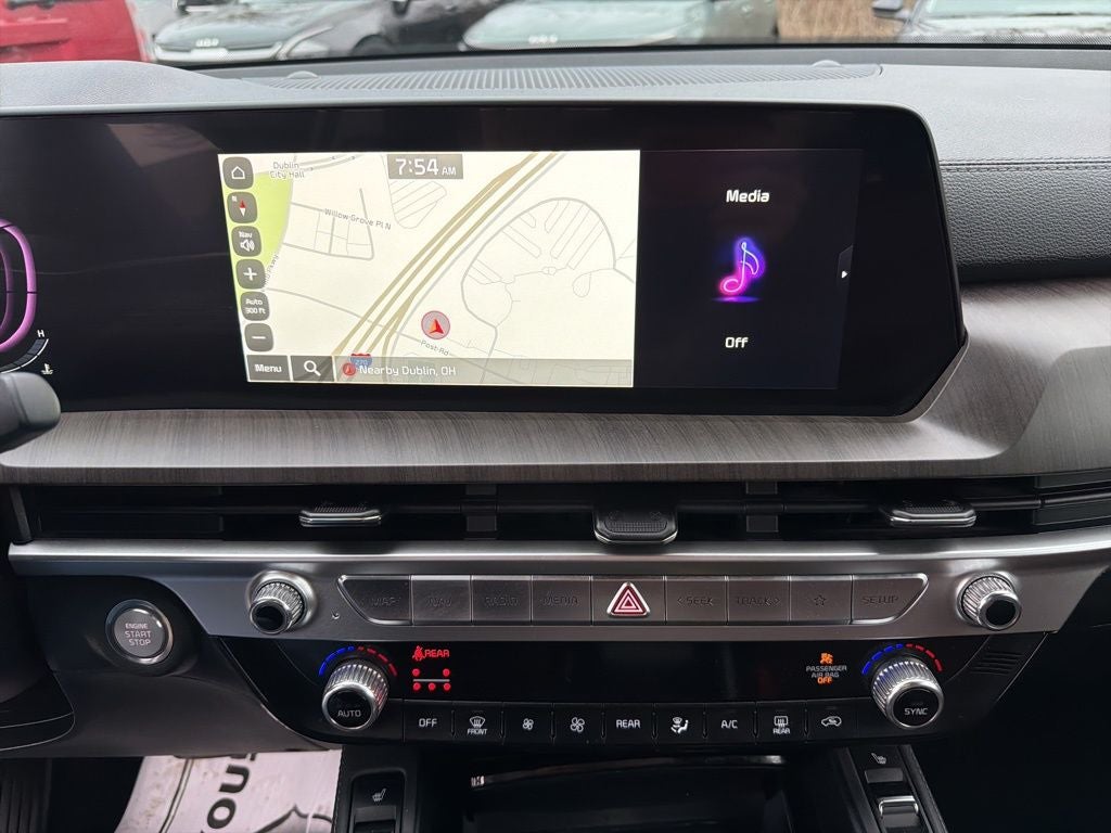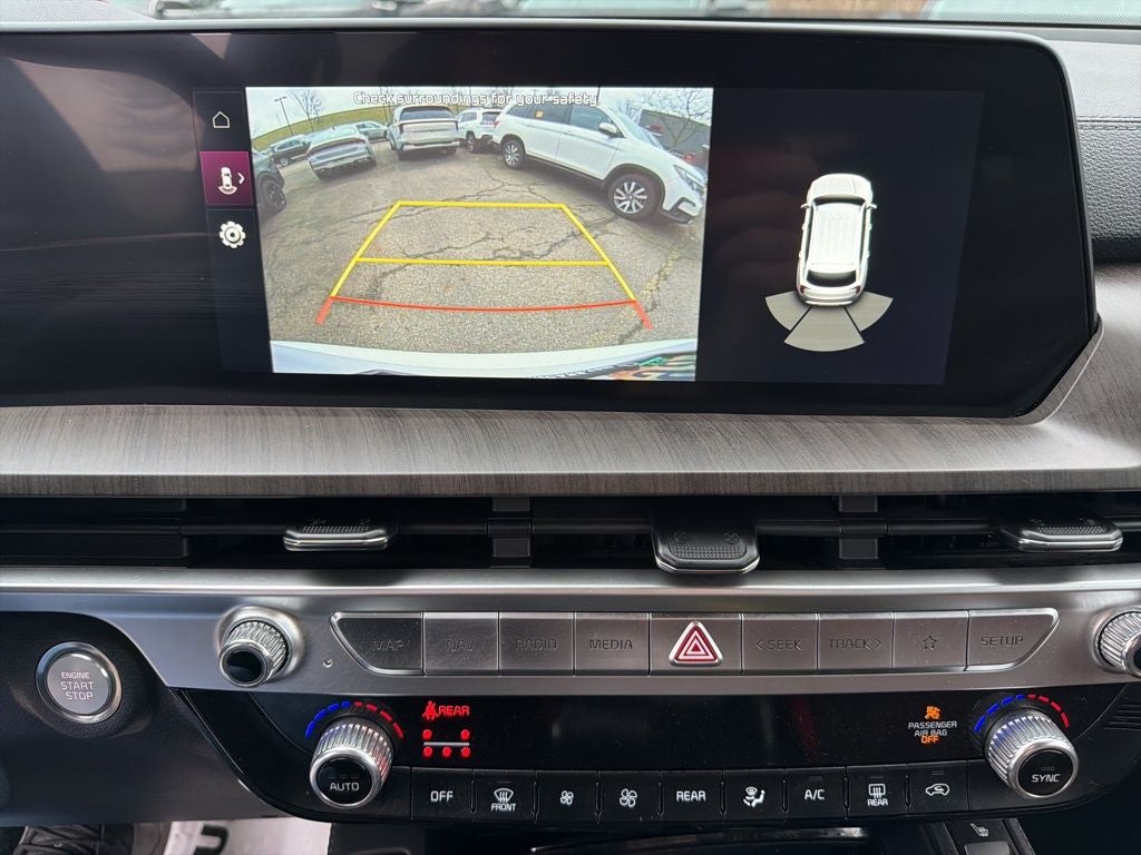 Equipped with EX Captain's Chair Package (2nd Row Captain Chairs), Mahogany Interior Color Package, Kia Certified Pre-Owned Certified, 3.510 Axle Ratio, 3rd row seats: split-bench, 4-Wheel Disc Brakes, 6 Speakers, ABS brakes, Air Conditioning, Alloy wheels, AM/FM radio: SiriusXM, Apple CarPlay & Android Auto, Auto High-beam Headlights, Auto-dimming Rear-View mirror, Automatic temperature control, Brake assist, Bumpers: body-color, Carpet Floor Mats, Compass, Delay-off headlights, Driver door bin, Driver vanity mirror, Dual front impact airbags, Dual front side impact airbags, Electronic Stability Control, Emergency communication system: 911 Connect, Exterior Parking Camera Rear, Four wheel independent suspension, Front anti-roll bar, Front Bucket Seats, Front Center Armrest, Front dual zone A/C, Front reading lights, Fully automatic headlights, Heated & Ventilated Front Bucket Seats, Heated door mirrors, Heated front seats, Illuminated entry, Knee airbag, Leather Seat Trim, Leather Shift Knob, Leather steering wheel, Low tire pressure warning, Navigation System, Occupant sensing airbag, Outside temperature display, Overhead airbag, Overhead console, Panic alarm, Passenger door bin, Passenger vanity mirror, Power door mirrors, Power driver seat, Power Liftgate, Power moonroof, Power passenger seat, Power steering, Power windows, Radio data system, Radio: AM/FM Display Audio System, Rear air conditioning, Rear anti-roll bar, Rear audio controls, Rear reading lights, Rear seat center armrest, Rear side impact airbag, Rear window defroster, Rear window wiper, Reclining 3rd row seat, Remote keyless entry, Roof rack: rails only, Security system, Smart Key w/ Push Button and Remote Start, Speed control, Speed-sensing steering, Split folding rear seat, Spoiler, Steering wheel mounted audio controls, Tachometer, Telescoping steering wheel, Tilt steering wheel, Traction control, Trip computer, Turn signal indicator mirrors, Variably intermittent wipers, Ventilated front seats, and Wheels: 20 x 7.5 Black Finish.