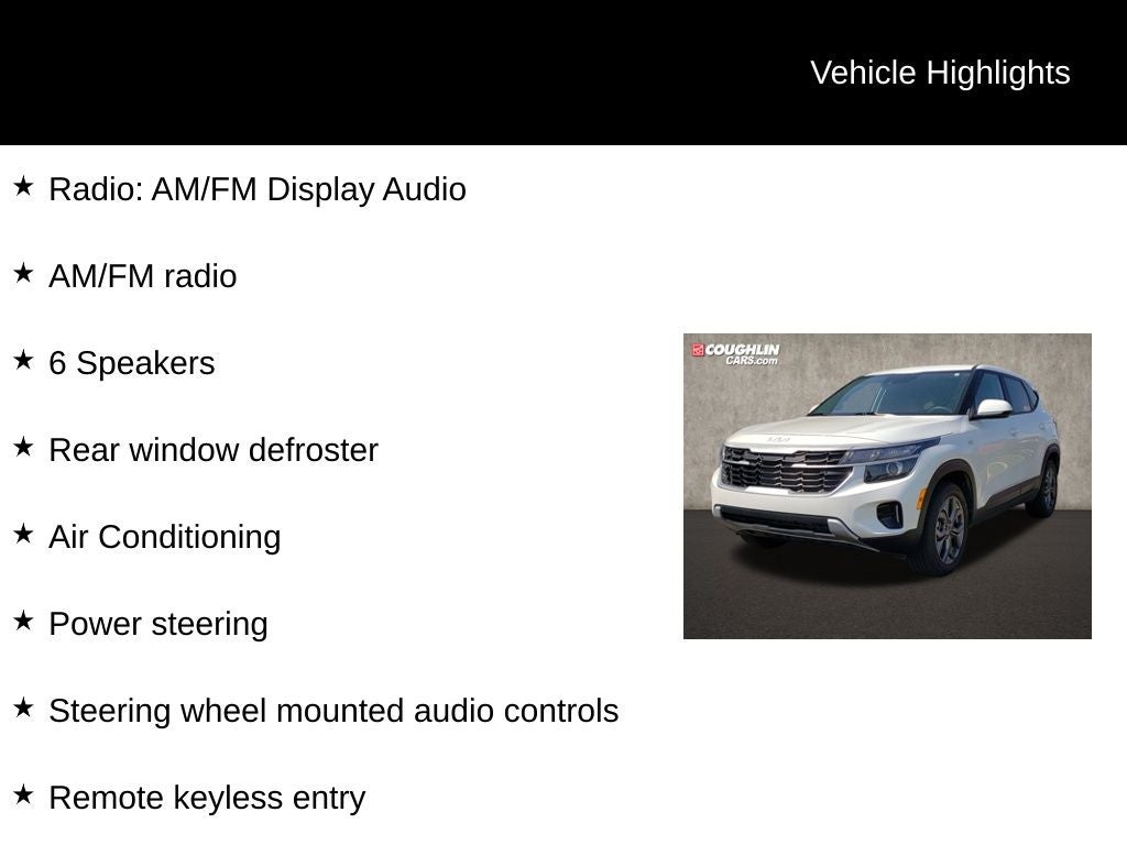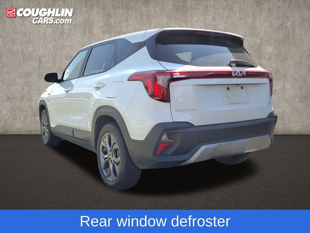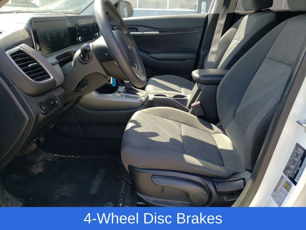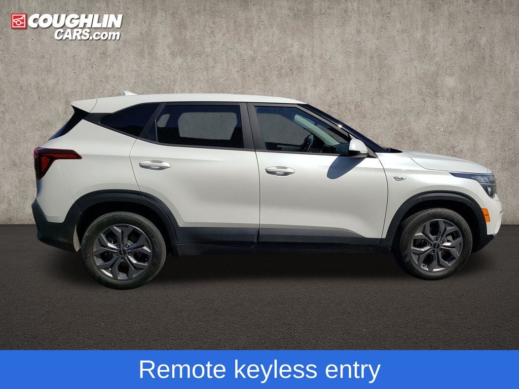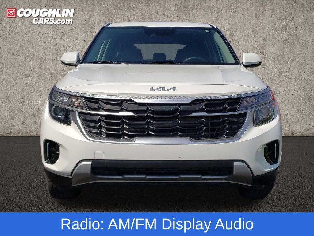 Snow White Pearl 2024 Kia Seltos LX AWD CVT 2.0L I4 MPI Seltos LX, 4D Sport Utility, 2.0L I4 MPI, CVT, AWD, Snow White Pearl, Black Cloth, 4-Wheel Disc Brakes, 6 Speakers, 6.052 Axle Ratio, ABS brakes, Air Conditioning, Alloy wheels, AM/FM radio, Apple CarPlay & Android Auto, Auto High-beam Headlights, Brake assist, Bumpers: body-color, Carpet Floor Mats, Cloth Seat Trim, Delay-off headlights, Driver door bin, Driver vanity mirror, Dual front impact airbags, Dual front side impact airbags, Electronic Stability Control, Exterior Parking Camera Rear, Four wheel independent suspension, Front anti-roll bar, Front Bucket Seats, Front Center Armrest, Front reading lights, Fully automatic headlights, Illuminated entry, Low tire pressure warning, Occupant sensing airbag, Outside temperature display, Overhead airbag, Overhead console, Panic alarm, Passenger door bin, Passenger vanity mirror, Power door mirrors, Power steering, Power windows, Radio: AM/FM Display Audio, Rear window defroster, Rear window wiper, Remote keyless entry, Security system, Speed control, Speed-sensing steering, Split folding rear seat, Spoiler, Steering wheel mounted audio controls, Tachometer, Telescoping steering wheel, Tilt steering wheel, Traction control, Trip computer, Variably intermittent wipers, Wheels: 17 Alloy w/Dark Gray Finish.
