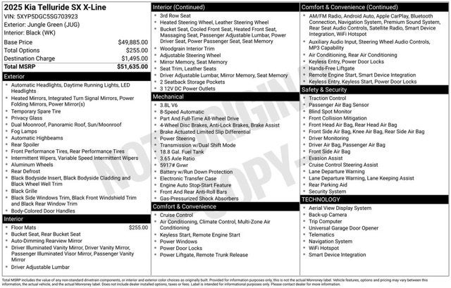 10 Speakers, 3rd row seats: split-bench, 4-Wheel Disc Brakes, ABS brakes, Air Conditioning, All Weather Floor Mats, Alloy wheels, AM/FM radio: SiriusXM, Apple CarPlay & Android Auto, Auto High-beam Headlights, Auto-dimming Rear-View mirror, Auto-leveling suspension, Automatic temperature control, Brake assist, Bumpers: body-color, Compass, Delay-off headlights, Driver door bin, Driver vanity mirror, Dual front impact airbags, Dual front side impact airbags, Electronic Stability Control, Emergency communication system: 911 Connect, Exterior Parking Camera Rear, Four wheel independent suspension, Front anti-roll bar, Front Bucket Seats, Front Center Armrest, Front dual zone A/C, Front fog lights, Front reading lights, Fully automatic headlights, Garage door transmitter: HomeLink, harman/kardon® Speakers, Heated & Ventilated Front Bucket Seats, Heated door mirrors, Heated front seats, Illuminated entry, Knee airbag, Leather Shift Knob, Leather steering wheel, Low tire pressure warning, Memory seat, Navigation System, Occupant sensing airbag, Outside temperature display, Overhead airbag, Overhead console, Panic alarm, Passenger door bin, Passenger vanity mirror, Power door mirrors, Power driver seat, Power Liftgate, Power moonroof, Power passenger seat, Power steering, Power windows, Radio data system, Radio: AM/FM Harman Kardon Audio System, Rear air conditioning, Rear anti-roll bar, Rear audio controls, Rear reading lights, Rear side impact airbag, Rear window defroster, Rear window wiper, Reclining 3rd row seat, Remote keyless entry, Security system, Speed control, Speed-sensing steering, Split folding rear seat, Spoiler, Steering wheel mounted audio controls, Tachometer, Telescoping steering wheel, Tilt steering wheel, Traction control, Trip computer, Turn signal indicator mirrors, Variably intermittent wipers, Ventilated front seats. 2025 Kia Telluride CARFAX One-Owner. Clean CARFAX.